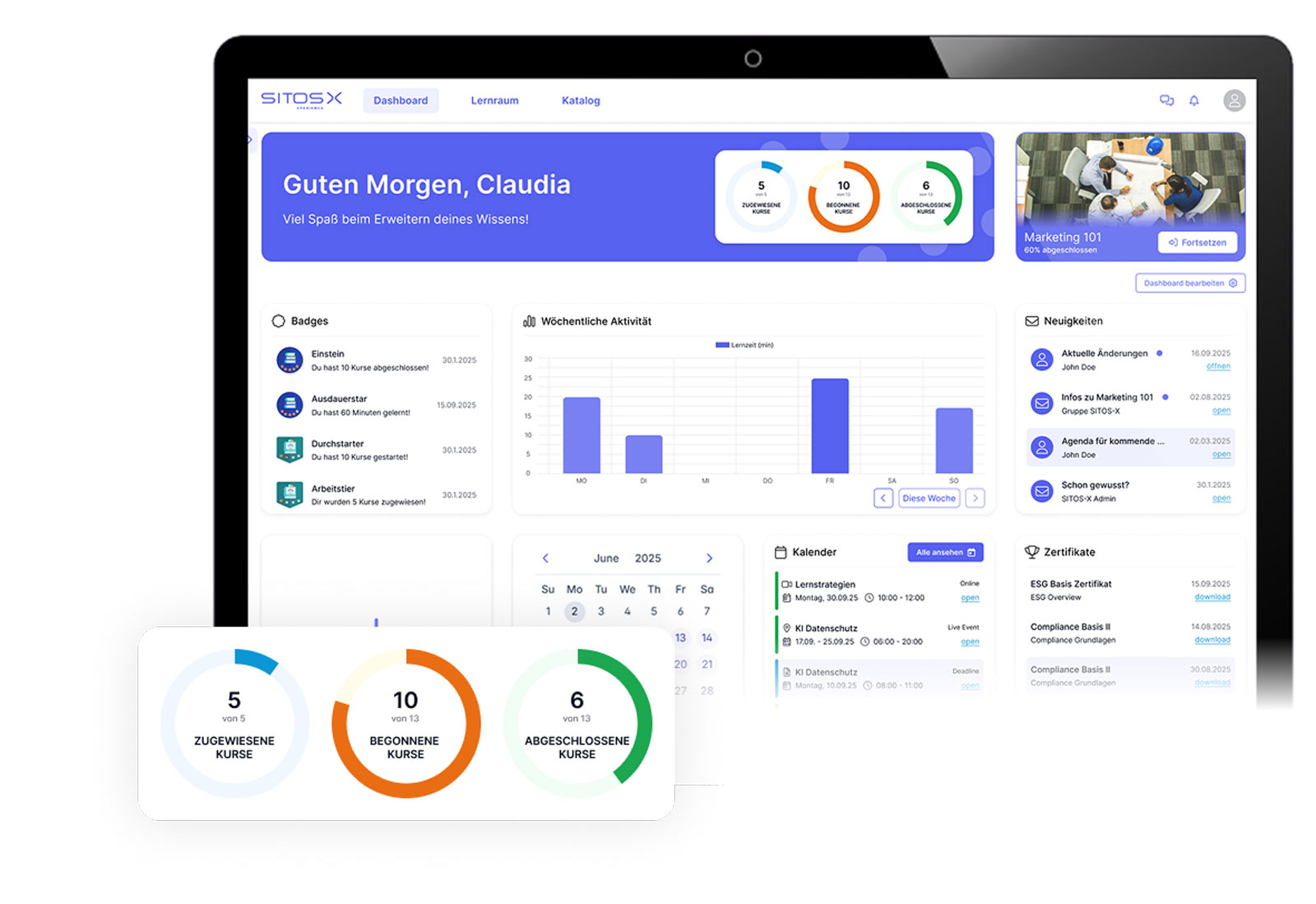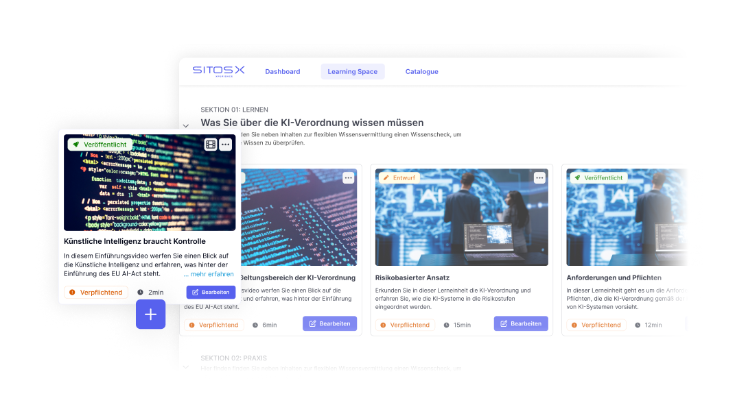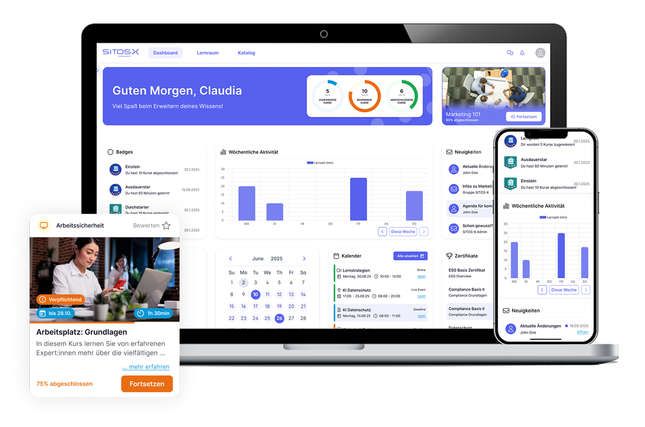 SITOS X ist Ihr digitales Learning-Ökosystem: Ein leistungsstarkes Learning Management System (LMS), eine motivierende Learning Experience Platform (LXP) und ein flexibles Learning Content Management System (LCMS) in einem. So gelingt Weiterbildung, die individuell, skalierbar und datensicher ist.